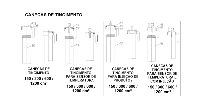 – Tampas especiais para canecas para facilitar adições químicas múltiplas vezes durante o processo de tingimento sem abrir a tampa