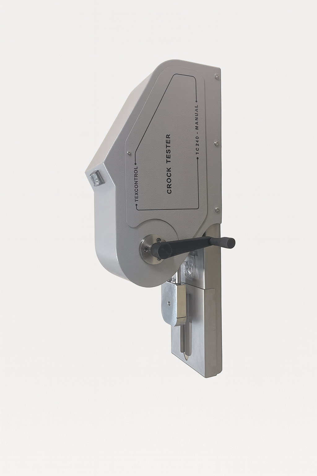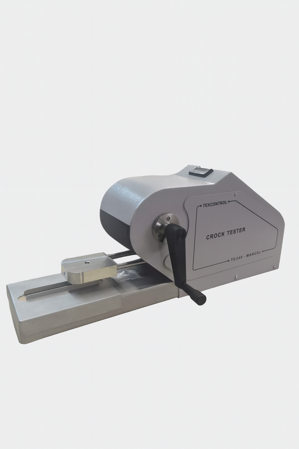 Equipamento manual de bancada, com controlador digital de ciclos e mesa de teste apoiada sobre rolamentos, destinado a testes de avaliação da transferência de cor de materiais têxteis de qualquer natureza de transformação quando submetidos à fricção com outro material têxtil.