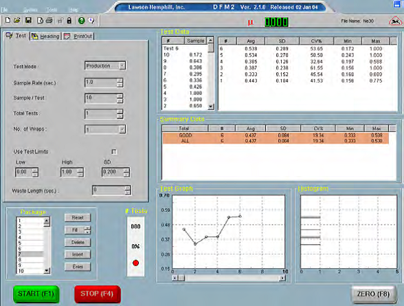Fornece continuamente os valores médios de fricção, o desvio padrão e o CV%, além de um histograma e gráfico comparativo entre as amostras. O software permite a leitura do DFM (Digital Friction Meter) diretamente no seu computador pessoal ou laptop com um pacote estatístico completo. Com apenas um simples clique ocorre a transferência desses resultados para uma planilha do Excel ou CVS.
