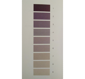 A Escala de Iodo (Violeta) – Tegewa é um padrão de referência visual utilizado para avaliar a intensidade e uniformidade da reação de tingimento em tecidos de algodão, especialmente em testes de corantes índigo ou outros corantes vat e reactivos.
