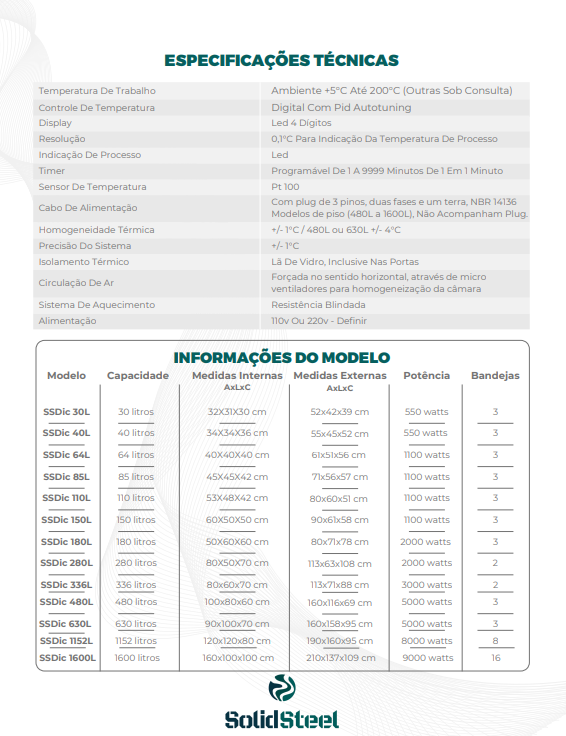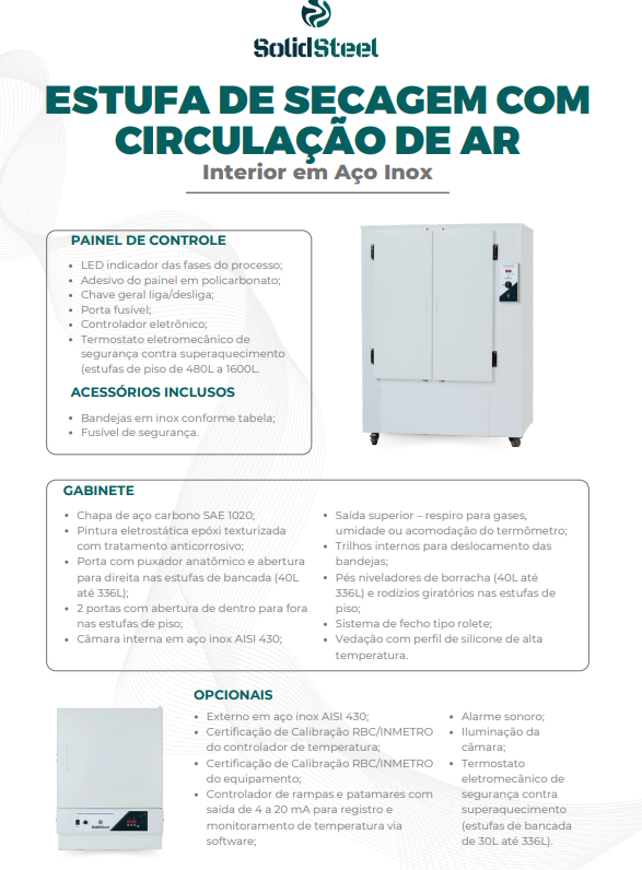 A Estufa de Secagem com Circulação de Ar da SolidSteel é um equipamento robusto e preciso, projetado para processos de secagem, cura, esterilização e envelhecimento térmico em ambientes laboratoriais e industriais. Com interior em aço inox, controle digital de temperatura via PID, circulação de ar forçada e diversas capacidades (de 30L a 1600L), garante excelente uniformidade térmica, segurança operacional e alto desempenho nos mais diversos tipos de aplicação.