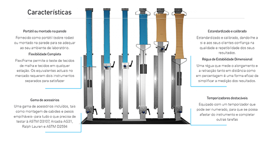 É um instrumento completamente flexível que permite testar tanto tecidos quanto malhas em uma ampla gama de teste