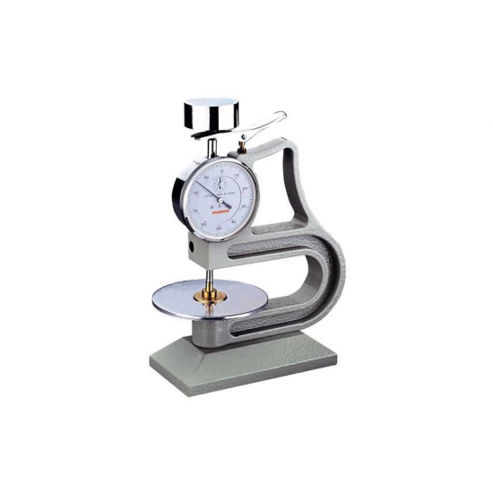 O operador posiciona a amostra entre a base plana e o relógio comparador (dial gauge). Ao abaixar suavemente a alavanca, o medidor entra em contato com a superfície do material, exibindo imediatamente a leitura exata da espessura na escala do indicador.