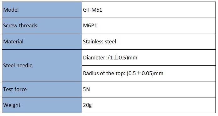 O GT-M51 Agulha de Teste de Vazamento Líquido é um dispositivo de medição utilizado para verificar se brinquedos preenchidos com líquidos apresentam vazamentos. Ele aplica uma força de 5N através de uma agulha de aço de 1 mm de diâmetro com raio de 0,5 mm na superfície do brinquedo.