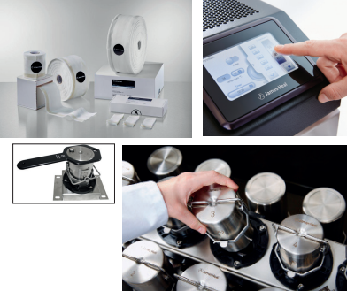 Recipientes de ensaio grandes ou pequenos são intercambiáveis, de modo que o teste possa ser realizado tanto para a norma ISO (recipientes pequenos) quanto para a norma AATCC (recipientes grandes). Nenhuma ferramenta ou peça adicional é necessária. Qualquer volume excedente se acumula em uma bandeja de gotejamento que pode ser removida e esvaziada.