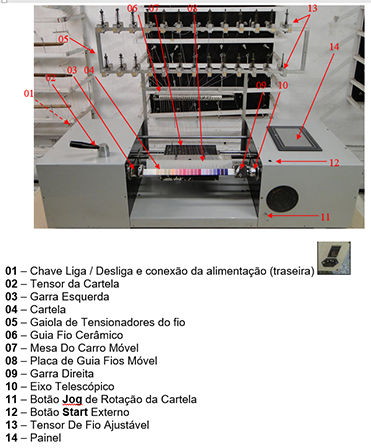 O tamanho da cartela pode ser variado. Cada posição de alimentação (fio ou filamento) possui um tensor regulável para controle da tensão de enrolamento da cartela.