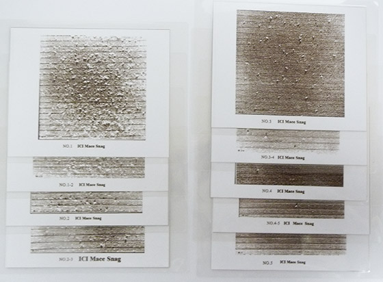 O Padrão Fotográfico ICI Mace Snag é um material de referência visual padronizado utilizado para avaliar o nível de formação de “snags” (puxados ou laçadas) em tecidos após ensaios no ICI Mace Snag Tester.