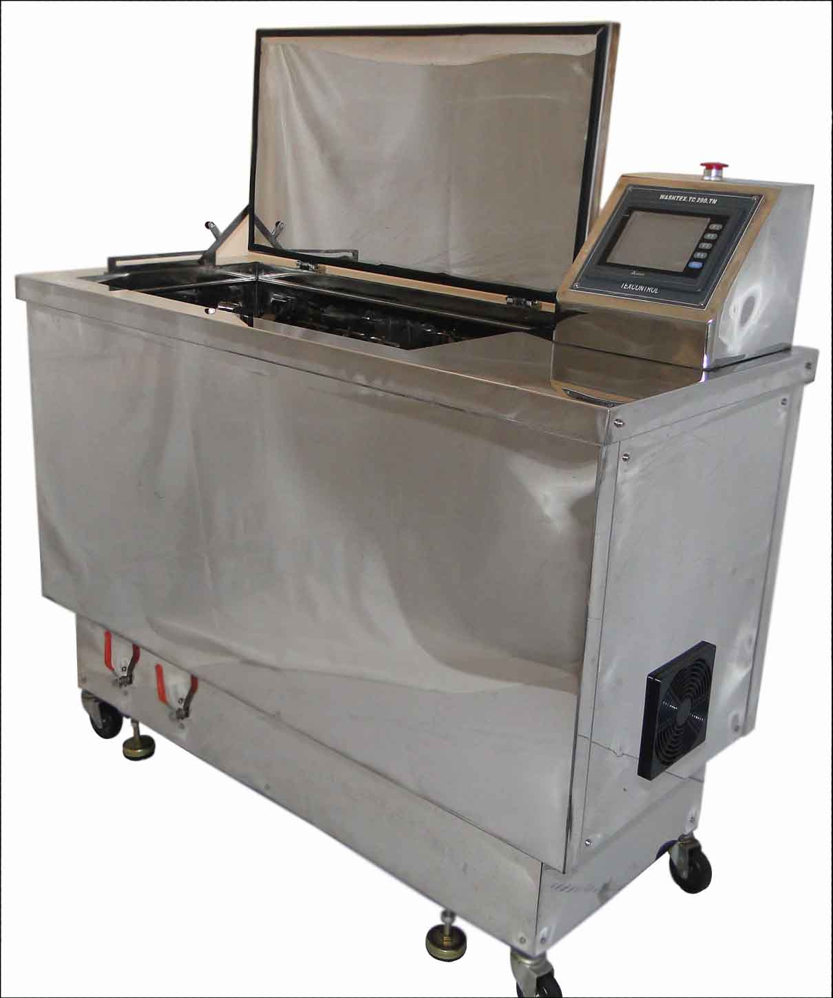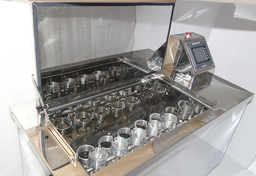 Para os ensaios de solidez à lavagem, o Wash Tex possui suportes de encaixe rápido em aço inoxidável com canecas acopladas, que giram com velocidade de acordo com as normas internacionais e em velocidade programável.